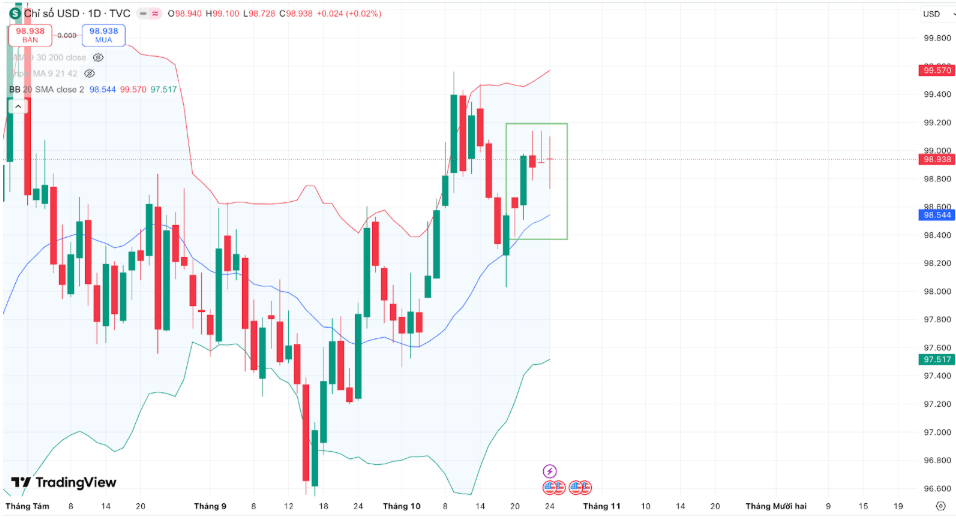 Chỉ số DXY duy trì trạng thái ổn định trong biên độ hẹp 98.51–99.14, đóng cửa quanh 98.91, cho thấy đồng USD gần như đi ngang dù xuất hiện nhiều yếu tố đáng lẽ có thể gây áp lực giảm giá. Một hiện tượng đáng chú ý là “nghịch lý CPI”: dù lạm phát Mỹ tháng 9 chỉ đạt 3,0% YoY, thấp hơn kỳ vọng 3,1%, khiến chứng khoán Mỹ bứt phá mạnh (Dow Jones vượt mốc 47.000 điểm), nhưng đồng USD không suy yếu tương ứng. Diễn biến này phản ánh cầu phòng thủ với USD vẫn còn dai dẳng, khi thị trường vẫn đối mặt với rủi ro thuế quan, sự chậm trễ dữ liệu kinh tế do chính phủ Mỹ tạm thời đóng cửa, và những bất định chính sách trước thềm cuộc họp FOMC.