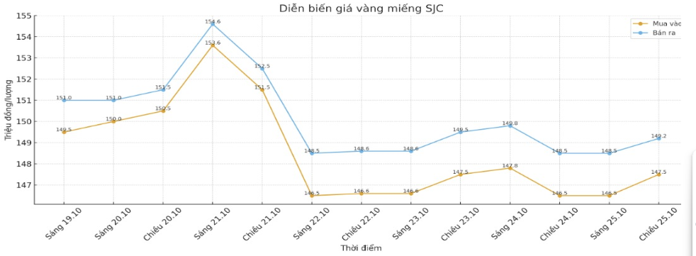 Tuần 20–25/10, giá vàng SJC biến động mạnh, đầu tuần lập đỉnh lịch sử 154,6 triệu đồng/lượng, sau đó giảm nhanh còn 149,2 triệu vào cuối tuần. Nguyên nhân do giá trong nước đảo chiều theo vàng thế giới khi kim loại quý quốc tế mất hơn ~200 USD/oz (~6 triệu đồng/lượng) do áp lực chốt lời. Dù nguồn cung SJC hạn chế, thị trường vẫn bám sát biến động toàn cầu, thể hiện phản ứng linh hoạt của các doanh nghiệp trước biến động mạnh của giá vàng quốc tế.
