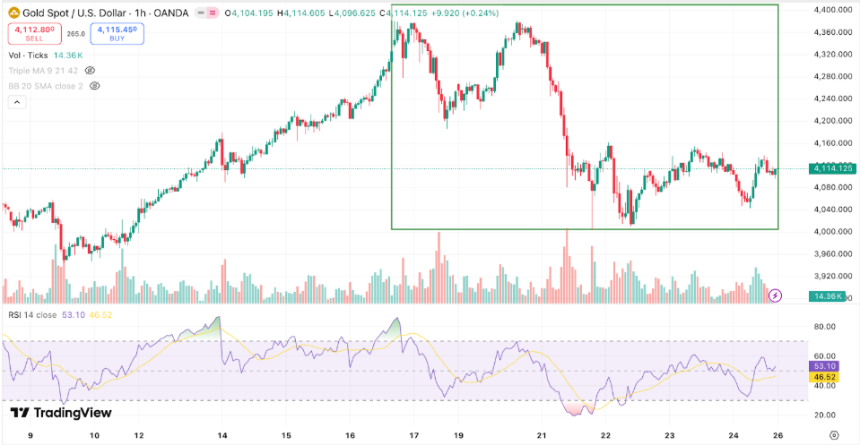 - Rủi ro: Sau đợt tăng nóng và cú rũ mạnh ngày 21–22/10, vàng đang bước vào giai đoạn tái cân bằng kỹ thuật. Động lượng ngắn hạn vẫn yếu khi giá chưa lấy lại đường MA9 (~4.195 USD/oz), trong khi RSI chỉ mới hồi phục lên vùng trung tính. Hoạt động chốt lời và thanh lý vị thế đòn bẩy vẫn còn hiện hữu, khiến giá có thể dao động trong biên độ 4.040–4.200 USD/oz trước khi xác lập xu hướng mới. Thị trường đang ở trạng thái thận trọng cao độ, chờ chất xúc tác từ các cuộc họp chính sách tiền tệ (FOMC, ECB, BoJ) trong tuần tới.