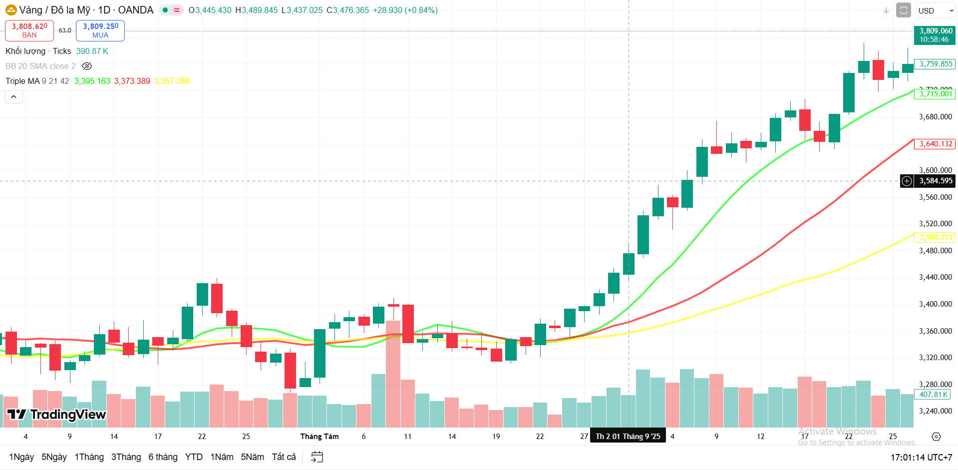 Tuần giao dịch từ 22 đến 26 tháng 9 năm 2025 được ghi nhận là một trong những tuần tăng trưởng mạnh mẽ nhất của thị trường vàng. Tuần giao dịch bắt đầu với một cú hích đầy ấn tượng, đưa giá vàng tăng vọt từ mức đóng cửa cuối tuần trước là 3.686,80 USD/ounce vào ngày 22/09 lên tới 3.746,47 USD/ounce, tương ứng mức tăng 1,63% trong ngày đầu tuần. Đà tăng này tiếp tục được duy trì vào ngày 23/09, khi giá vàng chạm mức cao nhất trong ngày là 3.791,11 USD/ounce, một kỷ lục mới mọi thời đại. Sự bứt phá này là một cột mốc tâm lý và kỹ thuật quan trọng, khẳng định sức mạnh của xu hướng tăng giá.