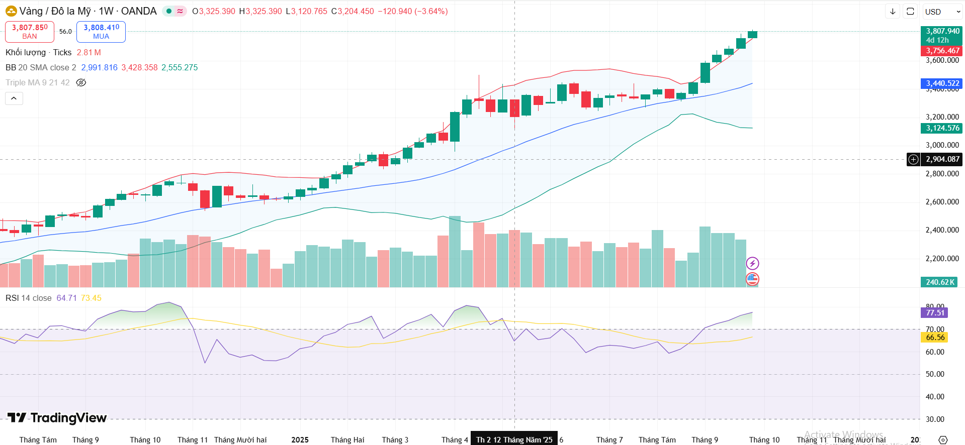 Dải Bollinger bung rộng, giá bám sát dải trên → xác nhận vàng đang trong pha “trend mạnh”. Đây là trạng thái thị trường “overbought” theo lý thuyết, nhưng chưa đồng nghĩa đảo chiều ngay, mà thường đi kèm hiện tượng “walk the band” – giá có thể tiếp tục duy trì ở dải trên trong nhiều tuần nếu động lực tăng còn mạnh.