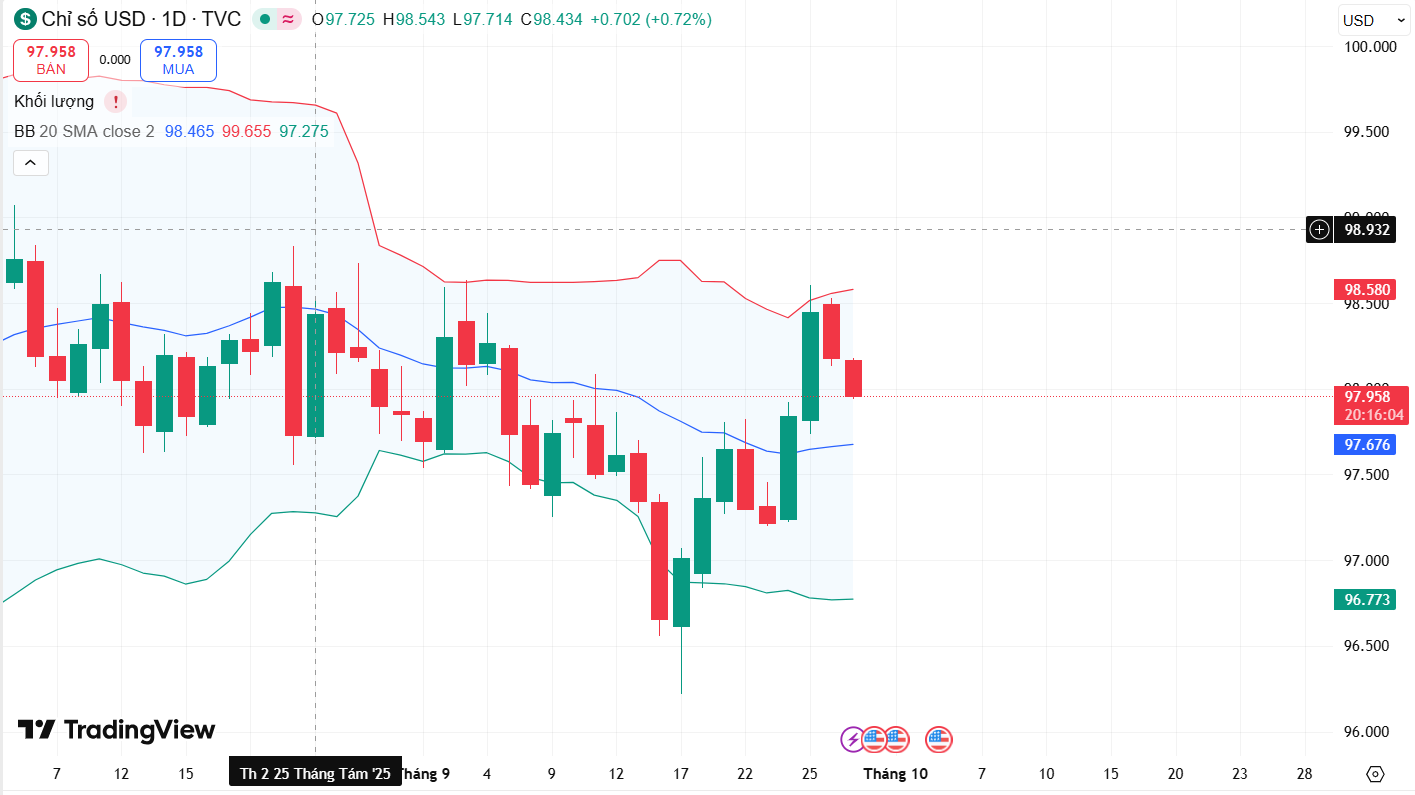 Trong tuần 22–26/9/2025, chỉ số DXY ghi nhận diễn biến hai chiều: đầu tuần suy yếu rồi bật tăng mạnh trước khi hạ nhiệt vào cuối tuần. Ngày 22–23/9, DXY giảm xuống quanh 97,3 khi các phát biểu của Fed mang tính thận trọng, nhấn mạnh rủi ro lạm phát kéo dài và thị trường lao động yếu, khiến kỳ vọng cắt giảm lãi suất duy trì. Đồng USD suy yếu đã hỗ trợ vàng leo lên vùng đỉnh gần 3.790 USD/oz nhờ lực mua trú ẩn. Tuy nhiên, từ giữa tuần, dữ liệu kinh tế Mỹ bất ngờ tích cực – GDP quý II tăng 3,8%, đơn hàng nhà máy cải thiện, đơn xin trợ cấp thất nghiệp giảm – làm giảm khả năng Fed hạ lãi suất nhanh chóng, kéo DXY tăng vọt lên quanh 98,5, mức cao nhất 3 tuần. Địa chính trị (thuế quan mới từ chính quyền Trump) cũng góp phần củng cố USD. Đến ngày 26/9, DXY bất ngờ hạ xuống 98,18, qua đó hỗ trợ vàng phục hồi về mức 3.760 USD/oz, giúp kim loại quý khép tuần với mức tăng khoảng 2% so với tuần trước. Nhìn chung, tuần qua cho thấy mối quan hệ ngược chiều rõ rệt: khi DXY suy yếu, vàng tăng mạnh; ngược lại, USD phục hồi thì vàng chịu áp lực điều chỉnh.