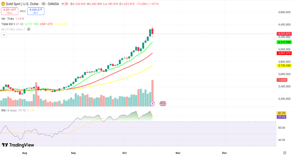 - Rủi ro ngắn hạn: Sau nhịp tăng mạnh vượt mốc $4.300/ounce, giá vàng đang bước vào vùng “quá mua” về mặt kỹ thuật, làm gia tăng khả năng xuất hiện nhịp điều chỉnh hoặc tích lũy ngắn hạn quanh vùng hỗ trợ mới. Giá vàng đang đối mặt với áp lực chốt lời ngắn hạn khi nhiều nhà đầu tư tranh thủ bán ra để hiện thực hóa lợi nhuận. Diễn biến này càng rõ nét hơn khi thị trường bắt đầu xuất hiện tín hiệu hạ nhiệt và tâm lý thận trọng quay trở lại.
