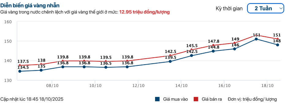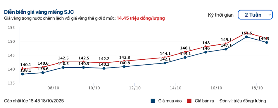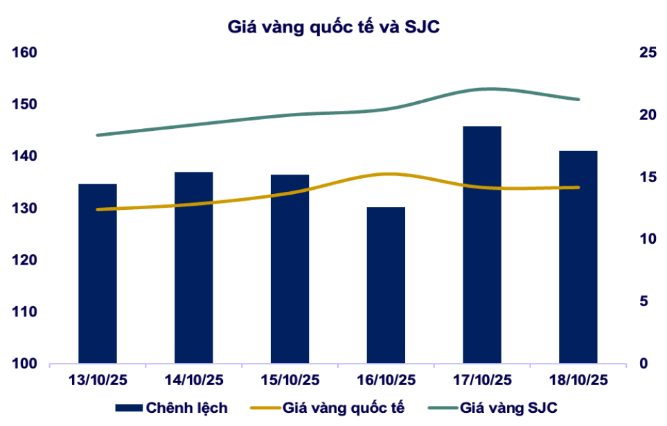 Chênh lệch giá vàng trong nước và quốc tế đầu tuần duy trì ổn định quanh mức 15 triệu đồng/lượng, nhưng đến ngày 17/10, giá vàng trong nước tăng mạnh hơn đà thế giới, đẩy mức chênh lệch lên tới 19 triệu đồng/lượng. Tuy nhiên, đến cuối ngày 18/10, khoảng cách này đã thu hẹp còn 17 triệu đồng/lượng khi giá vàng trong nước hạ nhiệt, phản ứng trước việc vàng thế giới điều chỉnh giảm mạnh phiên liền trước và nhiều nhà đầu tư trong nước tranh thủ bán chốt lời sau khi giá vàng nội địa lập đỉnh lịch sử.