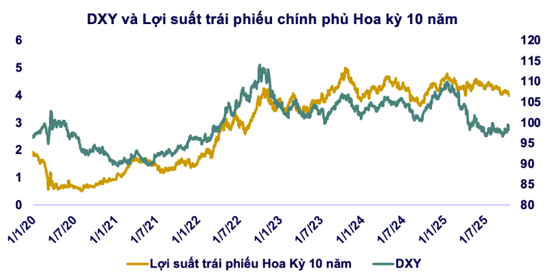 Trong bối cảnh Fed chuyển hướng dovish, đồng USD tuần qua có xu hướng giảm. Chỉ số DXY đã trượt từ vùng ~99 điểm xuống quanh 98,3 điểm vào cuối tuần, ghi nhận mức giảm khoảng 0,3% so với tuần trước. Việc USD suy yếu (cùng với lợi suất trái phiếu giảm) đã hỗ trợ đắc lực cho giá vàng thế giới, bởi vàng định giá bằng USD trở nên rẻ hơn tương đối. Việc DXY phục hồi nhẹ lại ở cuối tuần nguyên nhân đền từ ông Trump bất ngờ xuống giọng, tuyên bố các mức thuế cao hiện nay là “không bền vững”, giúp xoa dịu phần nào lo ngại chiến tranh thương mại, qua đó giúp DXY hồi phục.