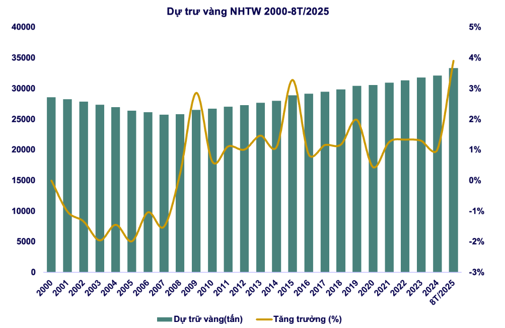 Từ năm 2000 đến 8T/2025, dự trữ vàng của các ngân hàng trung ương (NHTW) trải qua bốn pha rõ nét. Giai đoạn 2000–2008, các NHTW chủ yếu bán ròng để ưu tiên nắm giữ ngoại tệ, khiến lượng vàng dự trữ suy giảm. Bước sang 2009–2014, sau khủng hoảng tài chính toàn cầu, xu hướng đảo chiều khi các NHTW tích lũy mạnh để tái khẳng định vai trò trú ẩn an toàn của vàng. Giai đoạn 2015–2022, quy mô dự trữ tương đối ổn định quanh 30.000 tấn, tốc độ tăng chậm lại trong bối cảnh lãi suất USD cao. Từ 2023 đến 8T/2025, nhu cầu tăng vọt trở lại với mua ròng kỷ lục, tổng dự trữ vượt 33.000 tấn, tăng khoảng 4%—mức cao nhất trong một thập kỷ. Chuỗi dịch chuyển này phản ánh chiến lược giảm phụ thuộc USD và đa dạng hóa dự trữ trước bối cảnh địa chính trị và chính sách tiền tệ toàn cầu ngày càng biến động.