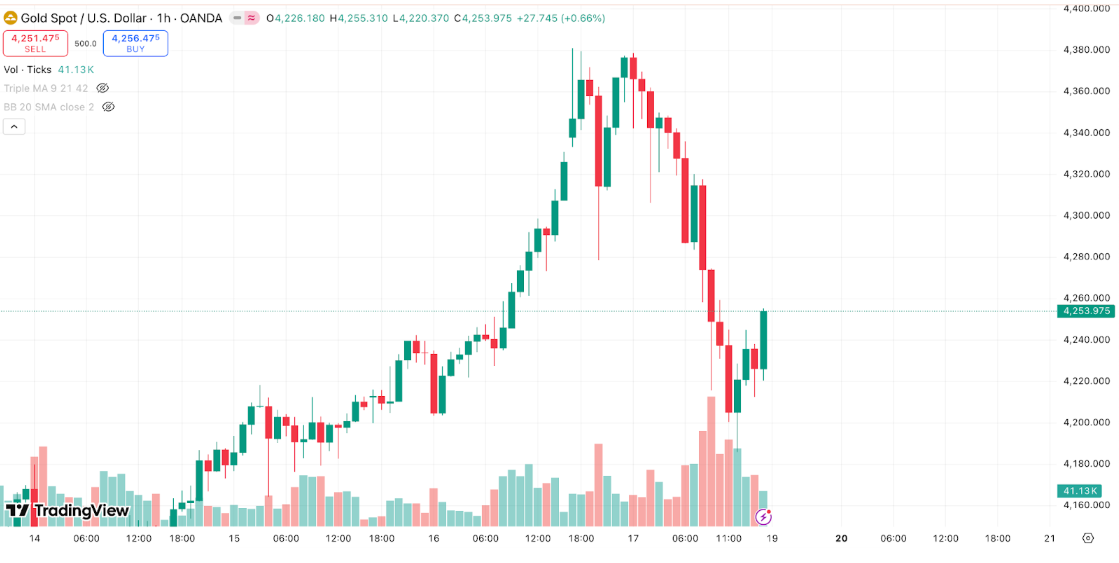 Tuy nhiên, sang 17/10, sau khi chạm đỉnh tuyệt đối ~$4.380/oz, giá vàng hạ nhiệt do USD phục hồi và phát biểu “hạ giọng” của Tổng thống Donald Trump về căng thẳng thương mại với Trung Quốc. Ông cho rằng mức thuế 100% là “không bền vững” và cử Bộ trưởng Tài chính Jeffrey Bessent gặp Phó thủ tướng Trung Quốc nhằm xoa dịu căng thẳng. Diễn biến này khiến vàng quay đầu điều chỉnh kỹ thuật, đóng cửa tuần ở khoảng $4.250/oz, nhưng vẫn tăng khoảng 6% so với tuần trước, củng cố vị thế của kim loại quý như tài sản trú ẩn hàng đầu trong bối cảnh bất định kinh tế toàn cầu.
