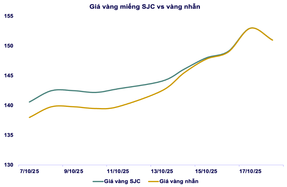 Trong tuần 13–18/10, giá vàng nhẫn tăng mạnh, đạt đỉnh ~151 triệu đồng/lượng, tương đương mức của vàng miếng SJC, trước khi điều chỉnh nhẹ về ~148–150 triệu đồng/lượng cuối tuần. Nhu cầu tích trữ vàng vật chất tăng cao do tâm lý phòng thủ trước biến động quốc tế, cùng với việc nguồn cung SJC hạn chế khiến dòng tiền chuyển hướng sang vàng nhẫn.