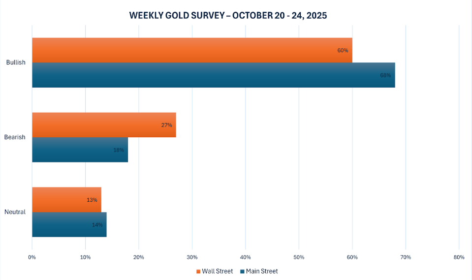 Còn tại Main Street, trong 265 nhà đầu tư cá nhân tham gia khảo sát, 68% dự báo giá tăng, 18% dự báo giảm và 14% dự báo đi ngang. Tâm lý lạc quan của nhà đầu tư nhỏ lẻ vẫn ổn định và bền vững, dù thị trường biến động mạnh quanh vùng 4.200 USD/oz.