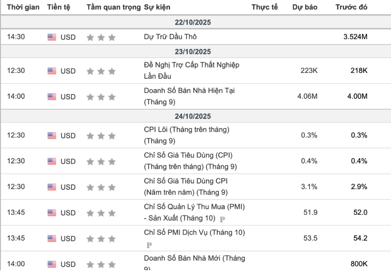 Trong bối cảnh chính phủ liên bang vẫn đóng cửa tại Hoa Kỳ, thị trường đang phải tạm thời theo dõi dữ liệu từ khu vực tư nhân, bao gồm số liệu bán nhà và dữ liệu sản xuất vào tuần tới. Tuy nhiên, thị trường sẽ nhận được một số số liệu lạm phát chính thức, vì Cục Thống kê Lao động đã triệu tập một số lượng hạn chế người lao động trở lại làm việc để công bố báo cáo CPI tháng 9, nhằm giúp chính phủ có thể tính toán mức điều chỉnh chi phí sinh hoạt hàng năm cho người hưởng An sinh Xã hội trước ngày 1 tháng 11. Vào thứ năm, thị trường sẽ nhận được doanh số bán nhà hiện tại trong tháng 9 và vào thứ sáu, báo cáo CPI tháng 9 dự kiến sẽ được công bố, tiếp theo là S&P Flash PMI. Đây là những chỉ báo then chốt định hình kỳ vọng cắt giảm lãi suất của Fed trong cuộc họp 28–29/10. Giá vàng nhiều khả năng biến động mạnh, với tâm điểm rơi vào ngày 24/10, khi hàng loạt dữ liệu vĩ mô được công bố dồn dập.