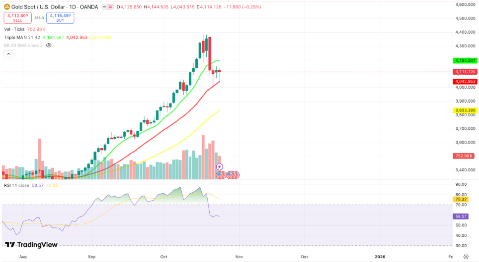 - Rủi ro: Sau đợt tăng nóng và cú rũ mạnh ngày 21–22/10, vàng đang bước vào giai đoạn tái cân bằng kỹ thuật. Động lượng ngắn hạn vẫn yếu khi giá chưa lấy lại đường MA9 (~4.195 USD/oz), trong khi RSI chỉ mới hồi phục lên vùng trung tính. Hoạt động chốt lời và thanh lý vị thế đòn bẩy vẫn còn hiện hữu, khiến giá có thể dao động trong biên độ 4.040–4.200 USD/oz trước khi xác lập xu hướng mới. Thị trường đang ở trạng thái thận trọng cao độ, chờ chất xúc tác từ các cuộc họp chính sách tiền tệ (FOMC, ECB, BoJ) trong tuần tới.