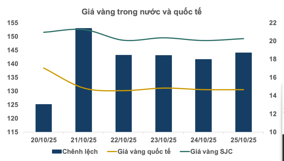 Trong tuần từ 20–25/10/2025, chênh lệch giá vàng trong nước – quốc tế tiếp tục duy trì ở vùng cao, dao động quanh 18–21 triệu đồng/lượng. Đáng chú ý, ngày 21/10, khi giá vàng thế giới chứng kiến cú sập thanh khoản mạnh (-8,6%), chênh lệch nội–ngoại nới rộng lên mức đỉnh gần 21 triệu đồng/lượng. Diễn biến này cho thấy thị trường trong nước phản ứng chậm hơn với biến động toàn cầu, trong khi nguồn cung vật chất hạn chế và tâm lý nắm giữ phòng thủ của nhà đầu tư nội địa đã giữ giá SJC ở mức cao. Từ 22–25/10, giá vàng quốc tế hồi nhẹ và đi ngang quanh vùng 4.100 USD/oz, khiến chênh lệch chỉ thu hẹp rất khiêm tốn.