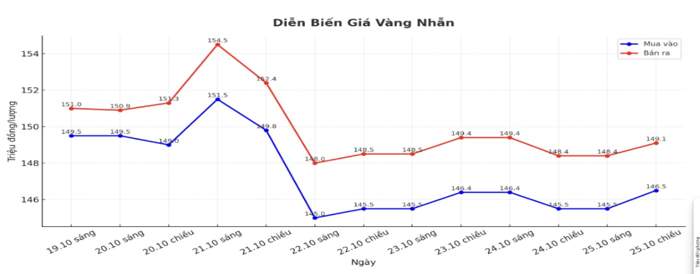 Tuần 20–25/10, vàng nhẫn 9999 biến động mạnh nhất thị trường, thậm chí vượt vàng miếng. Đầu tuần, giá tăng vọt theo đà thế giới, BTMC lập đỉnh 160,5 triệu đồng/lượng, cao hơn SJC gần 6 triệu do khan hàng và nhu cầu vật chất tăng mạnh. Giữa tuần sáng 22/10, giá giảm sâu tới 5–6 triệu đồng/lượng, rồi hồi nhẹ cuối tuần(24/10), chốt quanh 148,6 triệu đồng/lượng (bán ra). So với đầu tuần, vàng nhẫn giảm ~1,6 triệu đồng/lượng, biên độ dao động lên tới 12 triệu – lớn nhất thị trường. Nguyên nhândo cầu vật chất tăng đột biến, nguồn cung hạn chế và tâm lý đầu cơ mạnh, khiến vàng nhẫn phản ứng nhạy hơn SJC trước biến động giá quốc tế.