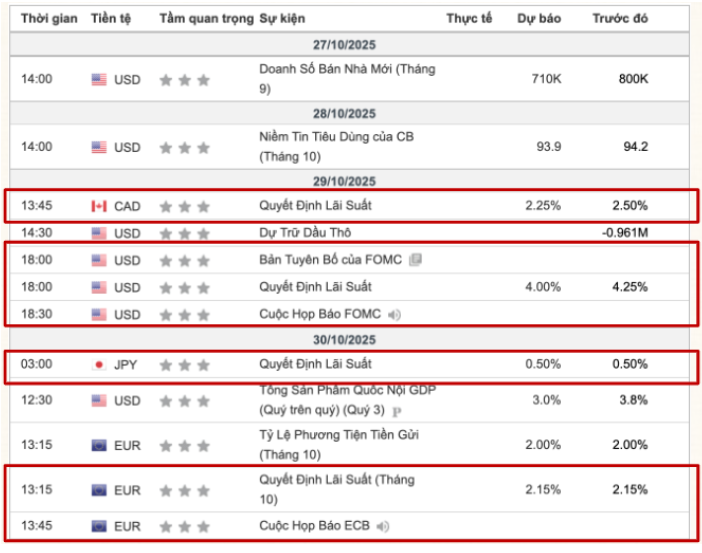 Tuần tới (27–31/10/2025), thị trường tài chính toàn cầu bước vào giai đoạn có tính chất bản lề khi trọng tâm chuyển dịch sang chuỗi quyết định chính sách tiền tệ của các ngân hàng trung ương lớn, đặc biệt là Cục Dự trữ Liên bang Mỹ (Fed). Do chính phủ Mỹ vẫn đang trong tình trạng đóng cửa tạm thời, khối lượng dữ liệu kinh tế công bố sẽ tương đối hạn chế, khiến giới đầu tư tập trung gần như hoàn toàn vào các tín hiệu từ Fed, ECB, BoJ và BoC để định hình kỳ vọng chính sách cho giai đoạn cuối năm. Theo lịch công bố, thứ Ba (28/10) Mỹ sẽ công bố Chỉ số Niềm tin Người tiêu dùng CB tháng 10, cung cấp góc nhìn sớm về sức khỏe chi tiêu hộ gia đình Mỹ – yếu tố then chốt quyết định quỹ đạo tăng trưởng quý IV. Thứ Tư (29/10) được xem là ngày giao dịch quan trọng nhất tuần, với hàng loạt sự kiện chính sách liên tiếp: