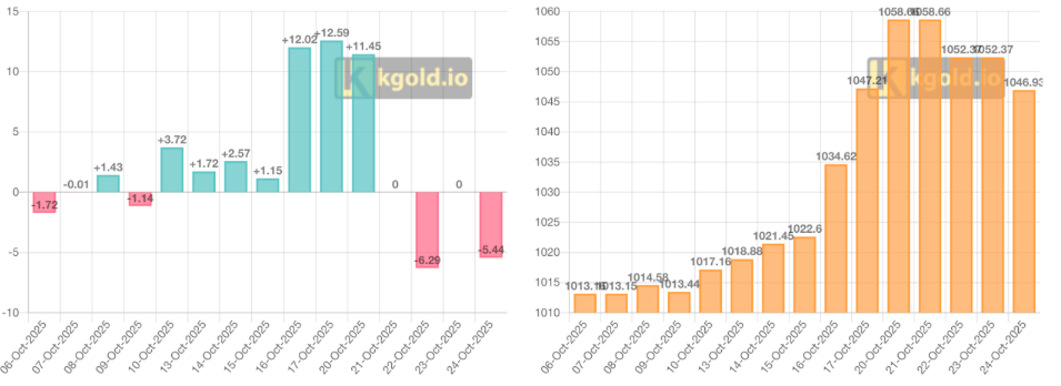 Hành vi mua – bán của SPDR trong tuần 20–24/10 cho thấy dòng vốn tổ chức đang thận trọng tái định vị trước các sự kiện chính sách tiền tệ lớn. Việc quỹ nhanh chóng đảo chiều từ mua ròng sang bán ròng phản ánh sự chuyển pha của tâm lý thị trường – từ hưng phấn sang phòng thủ. Đây là yếu tố quan trọng lý giải cho cú sập thanh khoản của vàng và quá trình tái cân bằng kỹ thuật đang diễn ra.
