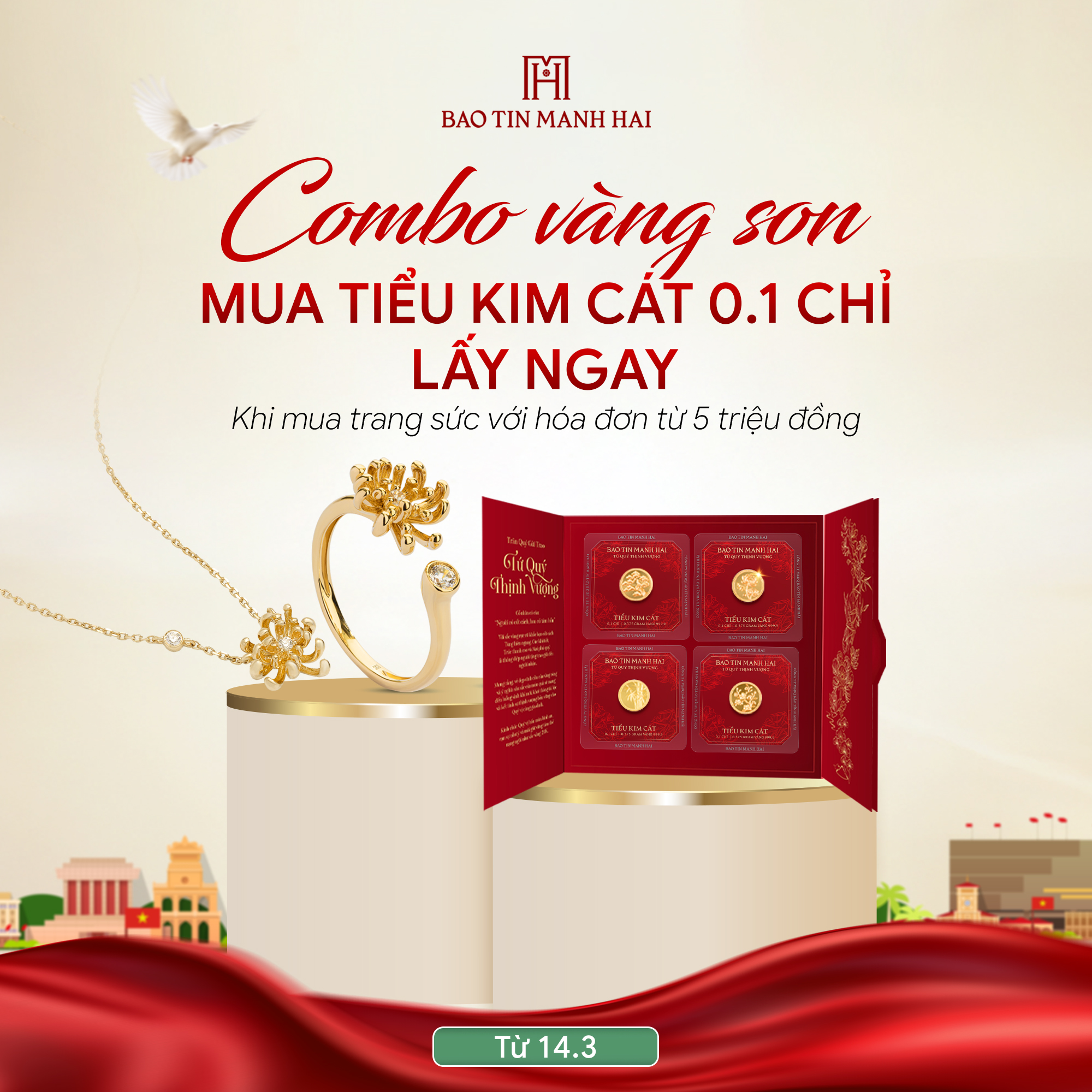 - Combo 3: Hóa đơn trang sức trị giá từ 40 triệu đồng trở lên và trọn bộ Tứ Quý Thịnh Vượng 0,1 chỉ đóng hộp