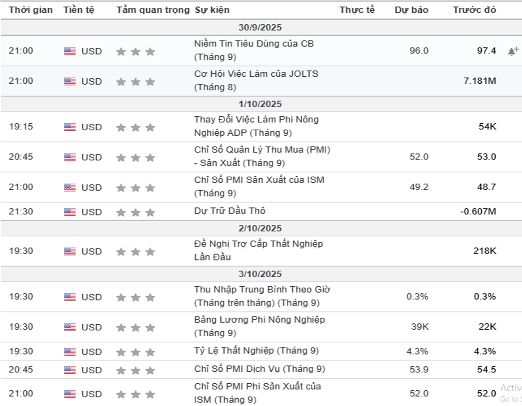 Trong tuần tới, thị trường vàng nhiều khả năng sẽ vận động thận trọng khi tâm điểm dồn vào loạt dữ liệu kinh tế Mỹ, đặc biệt là các báo cáo về thị trường lao động và PMI. Cụ thể, JOLTS, ADP (01/10) và quan trọng nhất là bảng lương phi nông nghiệp (NFP) cùng tỷ lệ thất nghiệp (03/10) sẽ định hướng kỳ vọng về chính sách của Fed; dự kiến NFP chỉ tăng 39 nghìn việc làm và tỷ lệ thất nghiệp giữ ở mức 4,3%, cho thấy dấu hiệu suy yếu của thị trường lao động, và nếu số liệu thực tế yếu hơn, lập luận của Chủ tịch Powell về “rủi ro giảm đối với việc làm” sẽ càng được củng cố, mở đường cho Fed tiếp tục cắt giảm lãi suất, qua đó hỗ trợ vàng. Ngược lại, một báo cáo việc làm bất ngờ tích cực có thể xóa bớt kỳ vọng nới lỏng và gây áp lực lên giá. Song song đó, PMI Sản xuất và Dịch vụ ISM tháng 9 (dự kiến lần lượt là 49,2 và 53,9) cũng sẽ được theo dõi sát sao: các con số yếu sẽ làm gia tăng lo ngại suy thoái, kích hoạt nhu cầu trú ẩn, trong khi kết quả mạnh sẽ khiến vàng kém hấp dẫn. Các dữ liệu bổ sung như niềm tin tiêu dùng và đơn xin trợ cấp thất nghiệp cũng đóng vai trò quan trọng trong việc định hình kỳ vọng chính sách. Nhìn chung, xu hướng dài hạn của vàng vẫn được củng cố bởi nền tảng vĩ mô và yếu tố địa chính trị, nhưng trong ngắn hạn, biến động giá sẽ phụ thuộc đáng kể vào sức khỏe của thị trường lao động và tín hiệu từ các chỉ báo PMI.