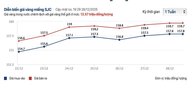 - Từ 25–28/12: Giữa tuần giá điều chỉnh nhẹ trước khi tăng trở lại vào cuối tuần, chốt ở 157,8 – 159,7 triệu đồng/lượng. Chênh lệch mua – bán ổn định quanh 1,9 triệu đồng/lượng.