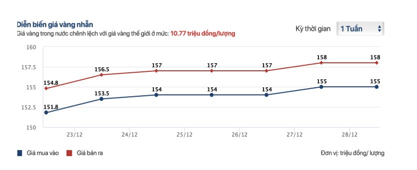 - Từ 27–28/12: Cuối tuần giá tăng nhẹ, chốt ở 155 – 158 triệu đồng/lượng, với biên mua – bán duy trì khoảng 3 triệu đồng/lượng, phù hợp nhu cầu tích trữ.