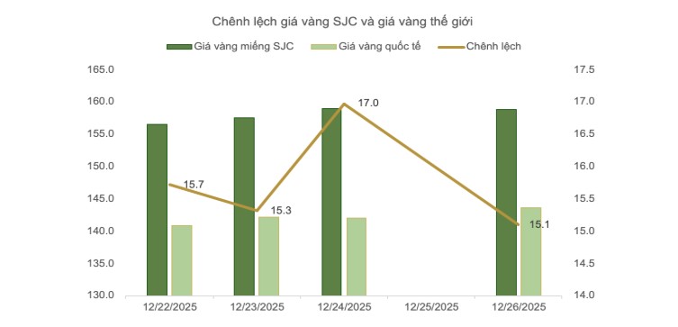 Sang phiên 24/12, giá vàng quốc tế điều chỉnh trong khi giá trong nước giữ ở vùng cao, khiến chênh lệch nới rộng lên khoảng 17 triệu đồng/lượng, mức cao nhất tuần. Đến cuối tuần, giá vàng thế giới phục hồi, kéo chênh lệch thu hẹp trở lại quanh 15,1 triệu đồng/lượng, cho thấy giá vàng trong nước tiếp tục điều chỉnh chậm hơn so với thị trường quốc tế.