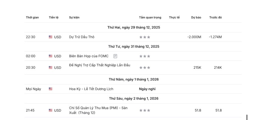 Tuần tới, thị trường sẽ theo dõi một loạt thông tin kinh tế quan trọng của Mỹ, trong đó đáng chú ý nhất là biên bản họp FOMC của phiên họp diễn ra ngày 9–10/12, dự kiến công bố vào rạng sáng 31/12/2025, giúp làm rõ quan điểm của Fed về triển vọng lạm phát, tăng trưởng và định hướng chính sách tiền tệ. Cùng ngày, Hoa Kỳ còn có tin tức về dữ liệu về đơn xin trợ cấp thất nghiệp lần đầu được công bố vào 31/12, được dự kiến tăng nhẹ, cho thấy thị trường lao động Mỹ có dấu hiệu hạ nhiệt nhưng vẫn duy trì trạng thái tương đối ổn định. Thứ Sáu (2/1/2026) công bố chỉ số PMI sản xuất tháng 12, chỉ báo quan trọng về mức độ mở rộng hay thu hẹp của khu vực sản xuất và triển vọng kinh tế đầu năm mới.