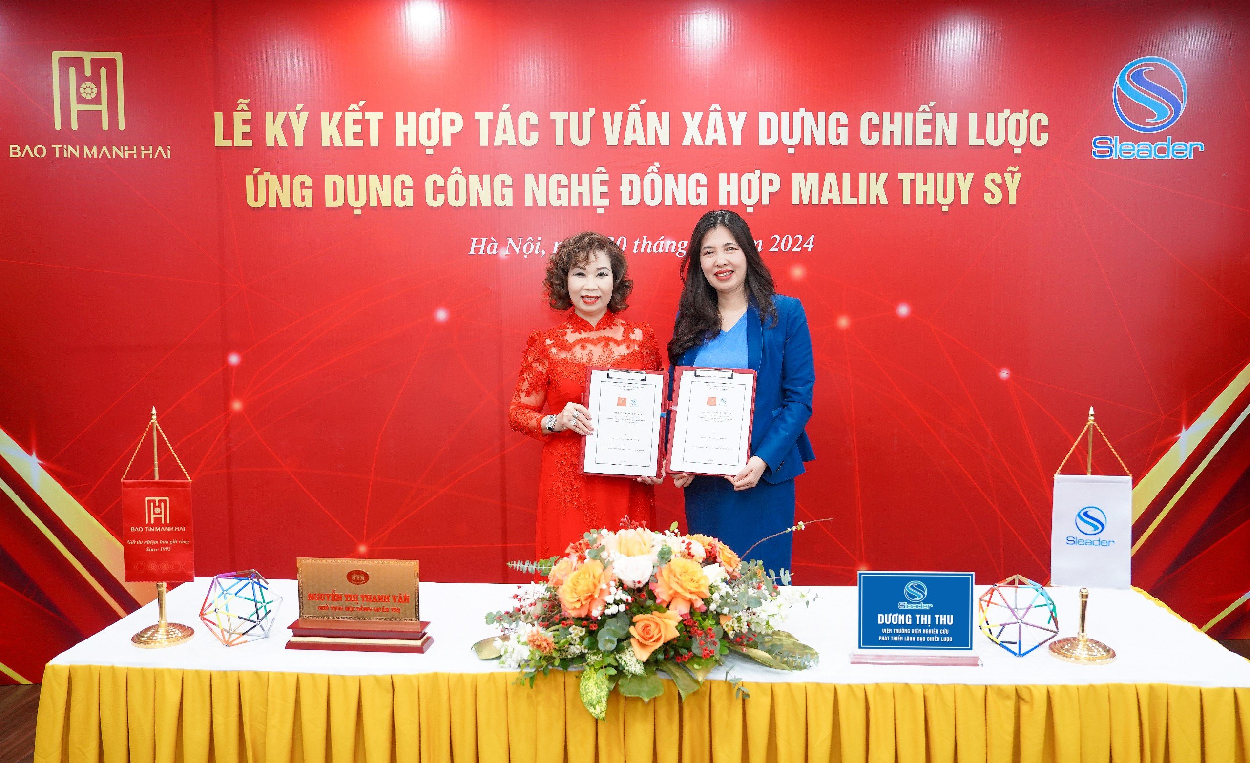 Chiều 30/01/2024, tại Hà Nội, Công ty Cổ phần Bảo Tín Mạnh Hải tổ chức lễ ký kết hợp tác tư vấn với Liên danh Malik Thụy sỹ & Sleader về việc Ứng dụng công nghệ Đồng hợp Malik trong xây dựng chiến lược cho công ty.